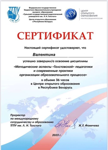 Международный сертификат Тульского педагогического университета: Толстовская педагогика( 2023г)